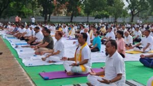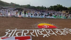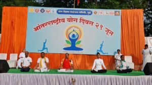 आंतरराष्ट्रीय योग दिनानिमित्त धुळे जिल्हा प्रशासन, जिल्हा क्रीडा अधिकारी कार्यालय, धुळे आणि आंतरराष्ट्रीय योग दिवस संयोजन समिती तसेच जिल्ह्यातील विविध संस्थांच्या संयुक्त विद्यमाने येथील पोलीस कवायत मैदानावर आज अकरावा आंतरराष्ट्रीय योग दिन हजारो नागरिकांच्या उपस्थितीत मोठ्या उत्साहात साजरा करण्यात आला.