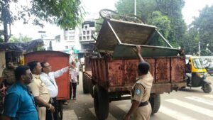 रहदारीच्या प्रमुख रस्त्यांवर वाहतुकीला अडथळा होईल अशा पध्दतीने टपर्या, लोटगाड्या लावून व्यवसाय करणार्यांमुळे देवपुरात एका निरपराध धुळेकराचा नाहक बळी गेला. त्यानंतर प्रशासन जागे झाले असून काल आग्रारोड साफ केल्यानंतर आज महापालिका आणि बांधकाम विभागाच्या संयुक्त मोहिम संतोषी माता मंदिर परिसर आणि साक्रीरोडवर राबवली जात आहे.
